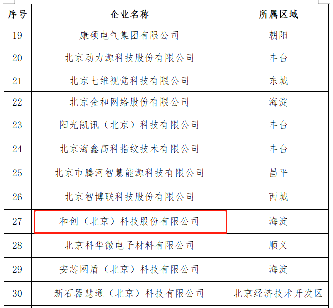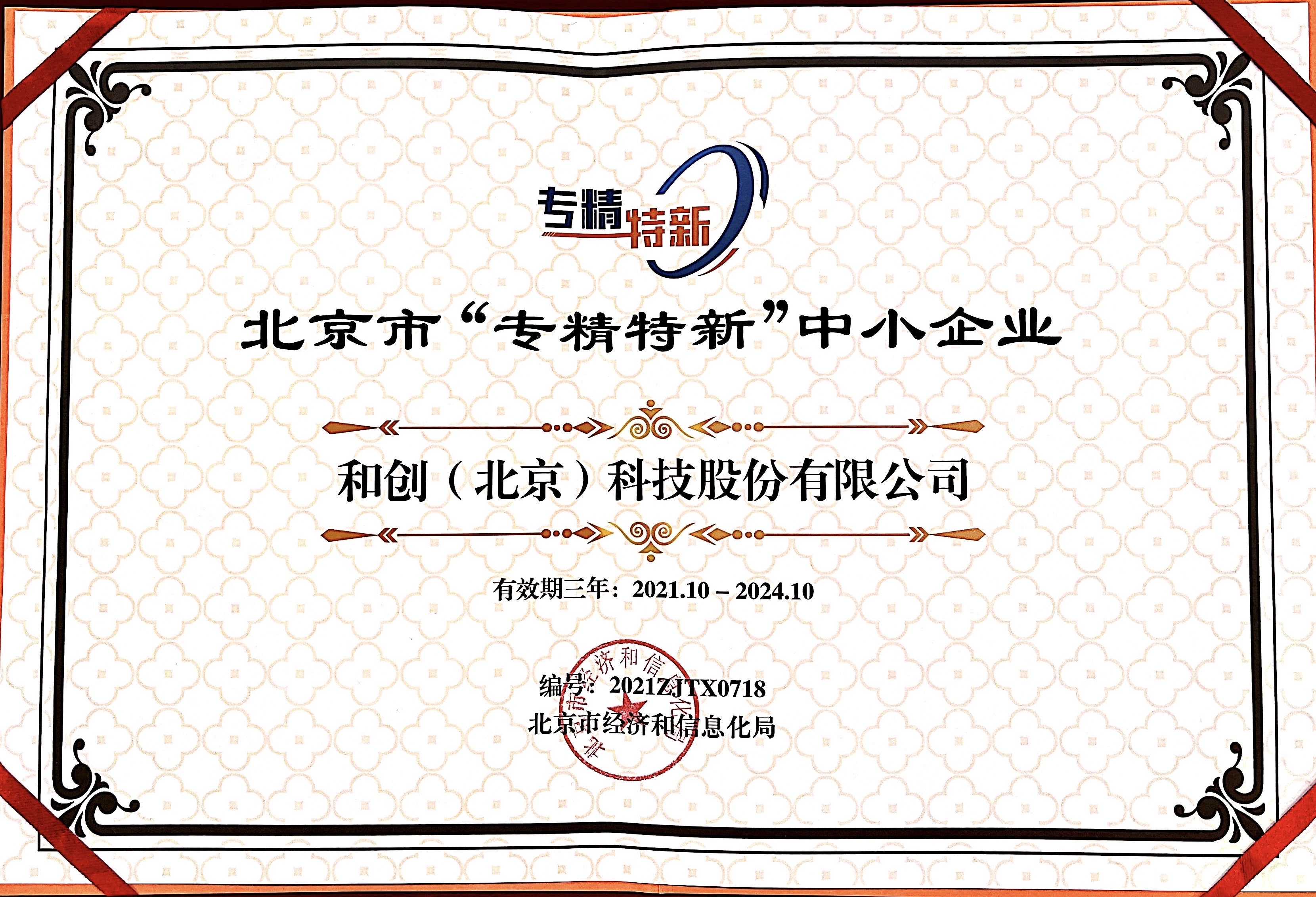 2021 年 10 月 29 日,北京市經(jīng)濟(jì)和信息化局將北京市 2021 年度第六批擬認(rèn)定“專精特新”中小企業(yè)名單予以公示,和創(chuàng)(北京)科技股份有限公司榮登榜單,此次公示期為 10 月 29 日至 11 月 4 日,目前已通過(guò)公示期。 根據(jù)北京市經(jīng)濟(jì)和信息化局的評(píng)審程序的有關(guān)規(guī)定,對(duì)于公示期無(wú)異議的,認(rèn)定為“北京市‘專精特新’中小企業(yè)”。