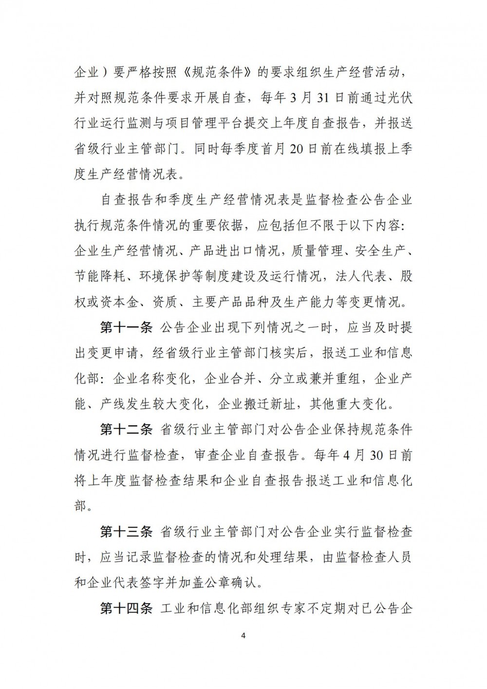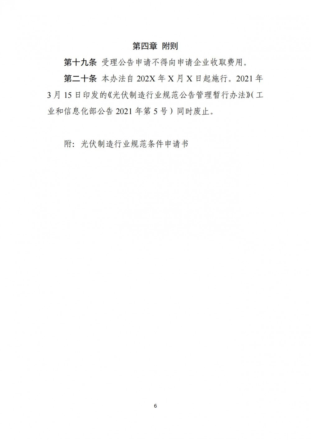 為進(jìn)一步加強(qiáng)光伏制造行業(yè)管理,促進(jìn)行業(yè)高質(zhì)量發(fā)展,工業(yè)和信息化部電子信息司對《光伏制造行業(yè)規(guī)范條件(2021年本)》《光伏制造行業(yè)規(guī)范公告管理暫行辦法(2021年本)》進(jìn)行修訂,形成《光伏制造行業(yè)規(guī)范條件(2024年本)》《光伏制造行業(yè)規(guī)范公告管理辦法(2024年本)》(征求意見稿),現(xiàn)公開征求意見。如有意見或建議,請于2024年7月15日前反饋至工業(yè)和信息化部電子信息司。