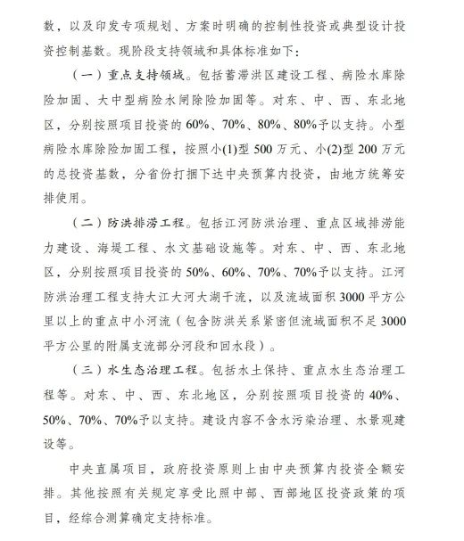 防洪排澇工程。包括江河防洪治理、重點區(qū)域排澇能力建設、海堤工程、水文基礎設施等。對東、中、西、東北地區(qū),分別按照項目投資的50%、60%、70%、70%予以支持。江河防洪治理工程支持大江大河大湖干流,以及流域面積3000平方公里以上的重點中小河流(包含防洪關系緊密但流域面積不足3000平方公里的附屬支流部分河段和回水段)。